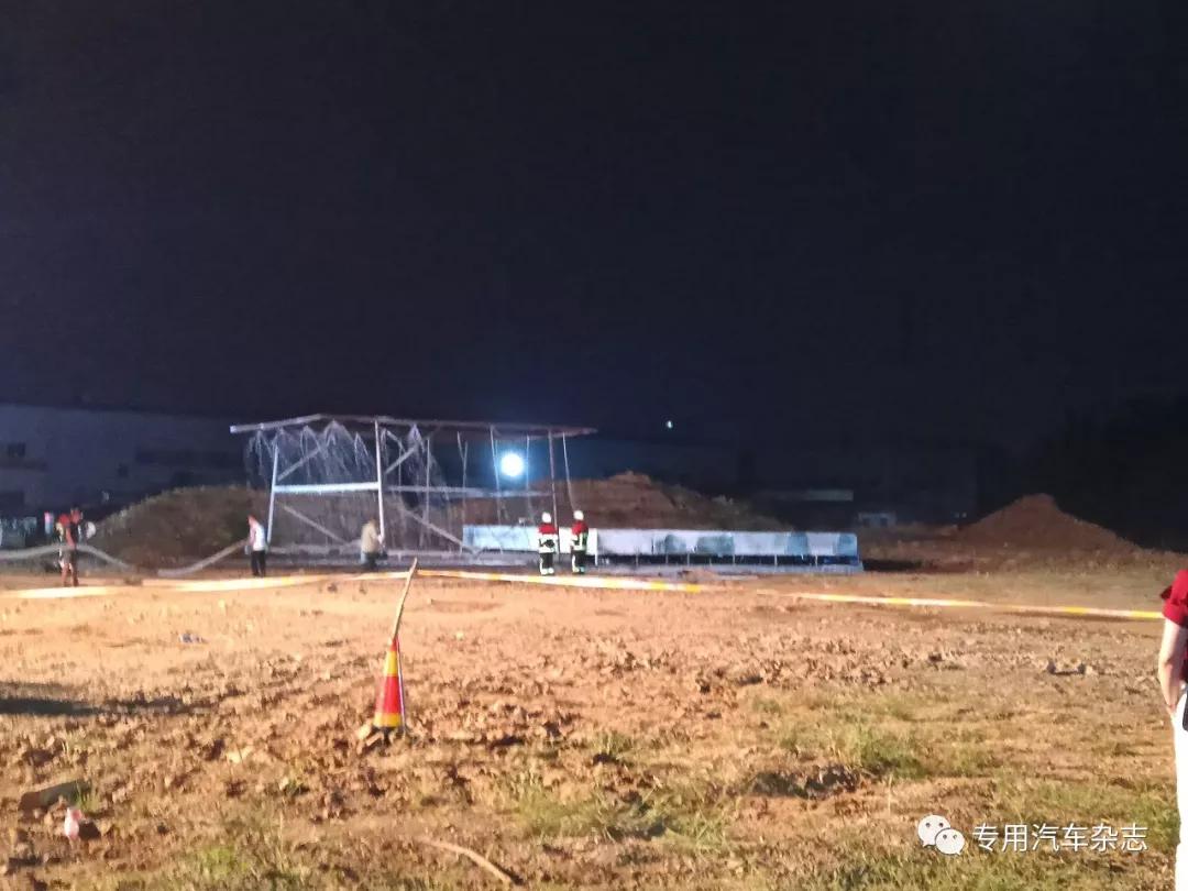 为了破解快速扑救换流站变压器火灾的难题,湖北江特专用特种汽车有限公司研发的压缩空气泡沫消防车于2018年8月25日晚7点在公司厂区内实施灭火试验,并邀请国家电网、中国石油、中国石化、应急救援国家工程实验室、上海消防研究所、天津消防研究所、湖北消防总队、随州消防支队、随州市、曾都区、市职等主要领导观摩指导。这次试验是全国乃至全球首次直流油大规模真火试验,针对性强,研究价值高,具有学术层面的国际影响力和现实的工程应用指导意义。本次试验,使用的是直流油,闪点不低于135℃;油池尺寸10m*10m,用油