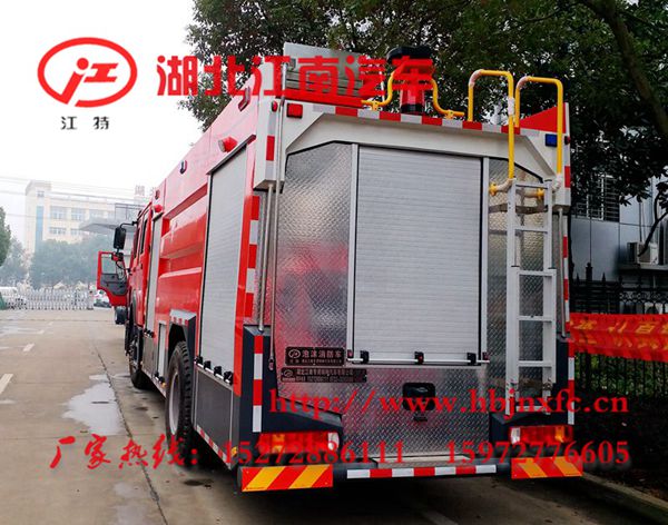 载液罐体为优质碳钢,内部喷涂环氧底漆及环氧沥青漆,与底盘采用弹性连接,载水8000kg,装备了上海雄真消防设备有限公司生产CB10/60型低压消防泵,额定流量60L/S/1.0Mpa。